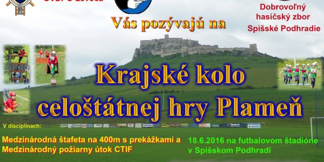 Mesto Spišské Podhradie ležiace v Levočskom okrese bolo 18.6.2016 miestom stretnutia hasičskej mlade od 8 do 16 rokov. V krajskom kole hry PLAMEŇ (koná sa raz za dva roky) sa zišli víťazné kolektívy mladých hasičov chlapcov i dievčat z okresov Prešovského kraja. Súťažili v zmysle medzinárodných pravidiel v dvoch disciplínach – v štafetovom behu na 400 …